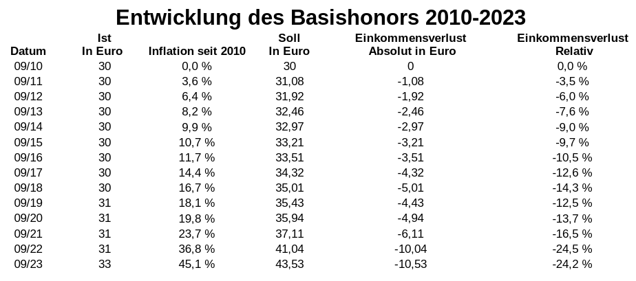 Also um 9,35 Euro, bzw. 8,32 Euro, weniger als der Basissatz von 2010 heute ausmachen würde. Das ist ein Einkommensverlust von 23,2 %, bzw. 22,9 %! In anderen Worten: Unser Honorar als Kursleiter:in ist seit 2010 um fast ein Viertel geschrumpft.